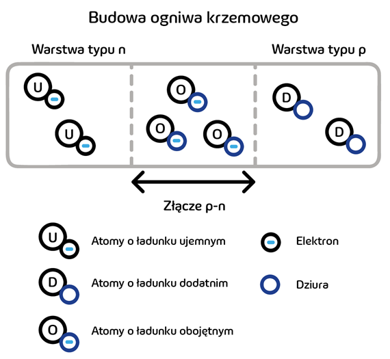 Wiemy już, że w zależności od rodzaju półprzewodnika z jakiego są zbudowane, ogniwa mogą w bardziej lub mniej efektywny sposób przekształcać energię słoneczną w energię elektryczną. Ale jak dochodzi w nich do zjawiska fotowoltaicznego i na czym ono polega? Aby zrozumieć lepiej efekt fotowoltaiczny omówmy najpierw budowę ogniwa krzemowego. Ogniwo składa się z dwóch warstw półprzewodnika. Jedna z nich zbudowana jest z atomów posiadających większą liczbę elektronów na ostatniej z powłok, przez co charakteryzuje się ładunkiem ujemnym (warstwa typu n). Druga zaś złożona jest z atomów posiadających puste miejsca po elektronach tzw. dziury (warstwa typu p). Warstwa ta charakteryzuje się dodatnim ładunkiem elektrycznym. Na granicy tych dwóch warstw atomy z warstwy typu n „oddają” swoje dodatkowe elektrony atomom z warstwy typu p zapełniając ich dziury. W ten sposób powstaje złącze p-n składające się z atomów o obojętnym ładunku elektrycznym.