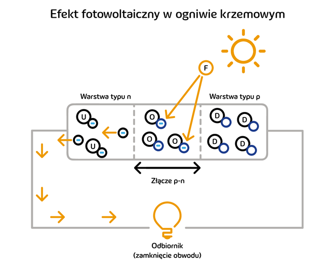 Produkcja energii elektrycznej w ogniwie fotowoltaicznym ma miejsce tylko wtedy, gdy pada na nie światło słoneczne. Promienie należy przy tym postrzegać, jako strumień cząsteczek (tzw. fotonów) posiadający porcję energii. Energia ta docierając do ogniwa zostaje pochłonięta przez elektrony znajdujące się na ostatniej z powłok elektronowych atomów krzemu na złączu p-n. Elektrony na skutek dostarczonej energii zostają „wybite” z powłok i krążą swobodnie po materiale półprzewodnikowym w warstwie typu n. Jednocześnie w warstwie typu p zwiększa się liczba atomów z dziurami. Prowadzi to do powstania różnicy ładunków na obydwu warstwach tzw. napięcia. Swobodne elektrony z warstwy n dążą do ponownego zapełnienia dziur w atomach znajdujących się w warstwie typu p. Jednak złącze p-n, pełniące rolę „izolatora”, skutecznie im to uniemożliwia. Przyłączenie odbiornika do ogniwa fotowoltaicznego, a tym samym zamknięcie obwodu elektrycznego spowoduje przepływ wolnych elektronów w kierunku atomów z ładunkiem dodatnim. Ten uporządkowany ruch elektronów to prąd! Jego natężenie jest proporcjonalne do natężenia promieniowania słonecznego, a także powierzchni ogniwa fotowoltaicznego.