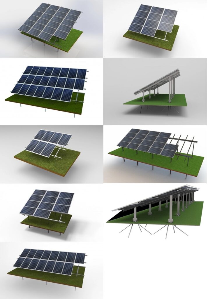 Konstrukcje naziemne w układach pionowych lub poziomych, dostosowane do typu podłoża: wbijane, wkręcane lub korzeniowe